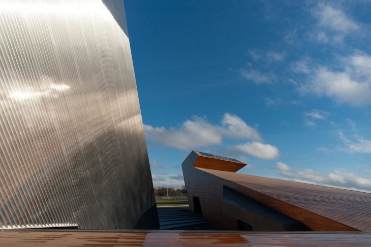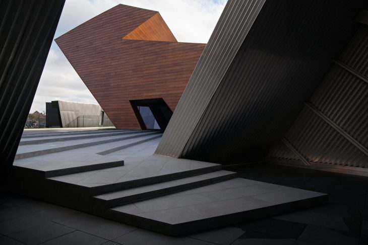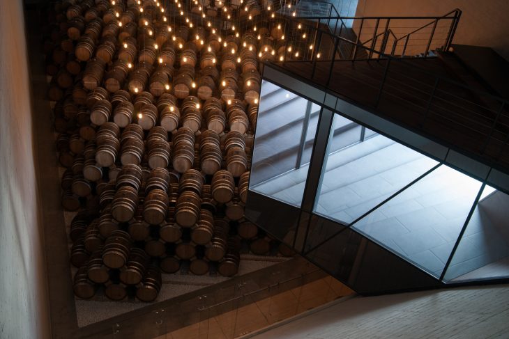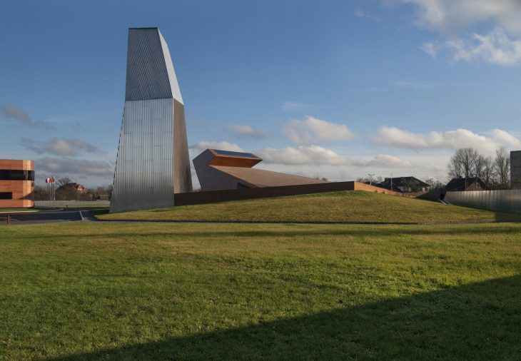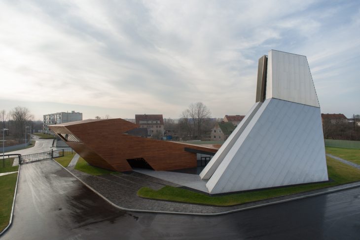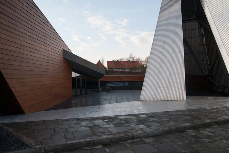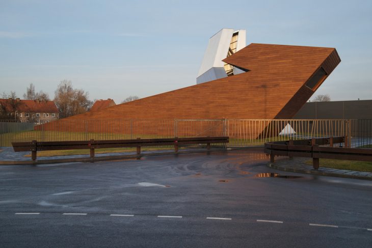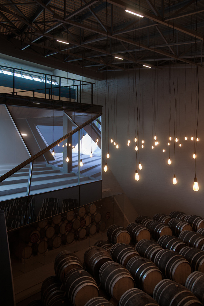 The building is located in Kaliningrad region in old German town which was seriously damaged during World War II. In an empty place adjacent to the railroad a modern plant of cognac production was built. Our task was a warehouse building project which apart from its main function – storing cognac tierces – would serve as a place of meetings and communication, guests reception as well as a symbol of creation and rebirth, demonstrating the role of the plant in the city life. The applied while considering all the parts of the project has led us to creation of an extremely symbolical architectural ensemble. Starting with the notion that the initial material cognac manufacturing deals with is a grapevine (a most mystical image in Christian symbols, embodying the sense of Tree of Life as well as Eucharist and Paradise (Holly Fire)) and wine (Divine Blood), — we decided to place the form under the authority of literary symbols, which are to create the images of harmonious interaction of various symbols and signs, sometimes opposite and antagonistic, but making stable pairs, giving rise to a new symbol. Internal and external, male and female, low and high, closed and opened, wood and metal – here is just a short list of pairs, which we used in order to create shapes of the buildings.
