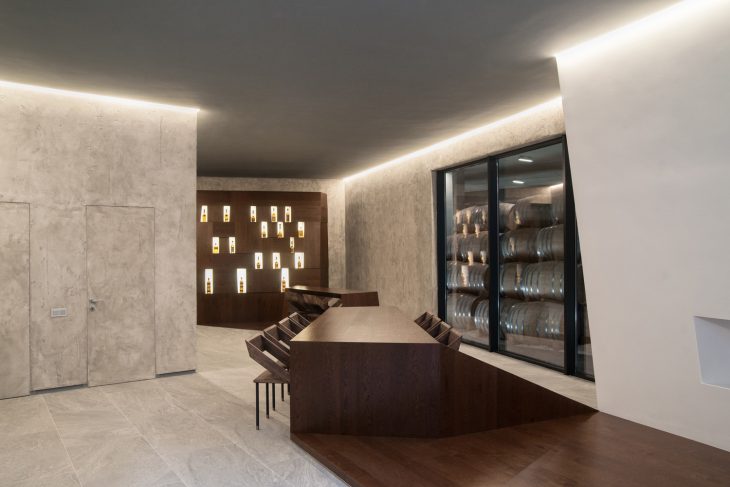 Buildings have been designed basing on the same geometrical platform (by which they are connected to the cognac distillery main building and to the site geometry as well). Each line both horizontal (according to the plan) and vertical (facades and sections) has been determined by a complicated geometrical scheme, which itself has formed the capacities of the buildings, and the architects appeared to be just tools of this structure, after it had been created by them.