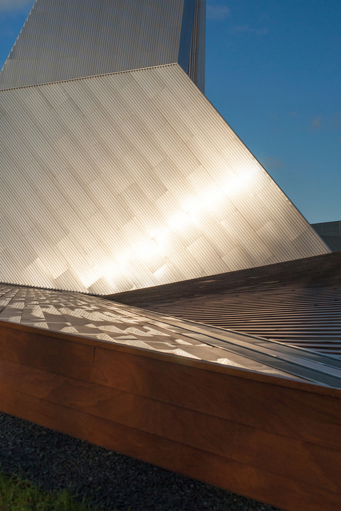 The low part of the capacity is turning into a ladder, which as a triangle runs into the horizontal capacity, allowing visitors to examine the warehouse interior, without entering. At the same time a tail of the wooden block on the other side also gets into the corpus of the high capacity as a triangle. In this plexus they give birth to a space between and inside themselves, organizing the around space together.