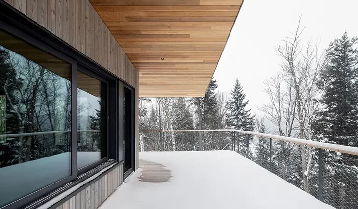 In North Hatley, a cantilevered house preserves mature trees while extending living space beneath generous roof planes.