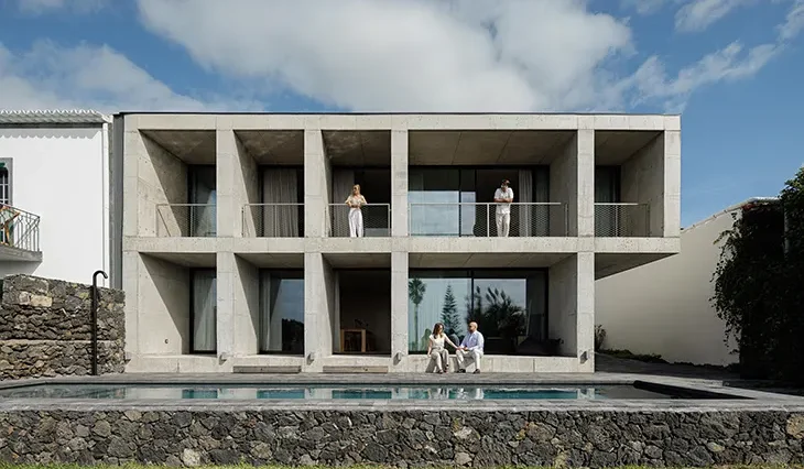 L2C Arquitetura designs a 550 m² terraced residence in Braga that follows the terrain through staggered horizontal planes and calibrated outdoor spaces.
