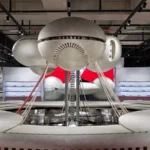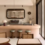 Inside, architecture and furniture operate as a single vocabulary. RootStudio designed custom pieces, a solid wood dining table with exposed joinery, a modular low-back sofa, and built-in benches, that extend the project’s constructive clarity. Surfaces use earthy tones and organic finishes, while bathrooms combine stone sinks with resin aggregates. The kitchen, conceived as a social hub, pairs tropical wood cabinetry with brushed steel fittings. The most distinctive feature appears in the main living room’s steel ceiling, transformed into a canvas by artists Sabino Guisu and Doktor Lakra. Their interventions allow shifting light to animate the structure, integrating art into the building’s fabric.