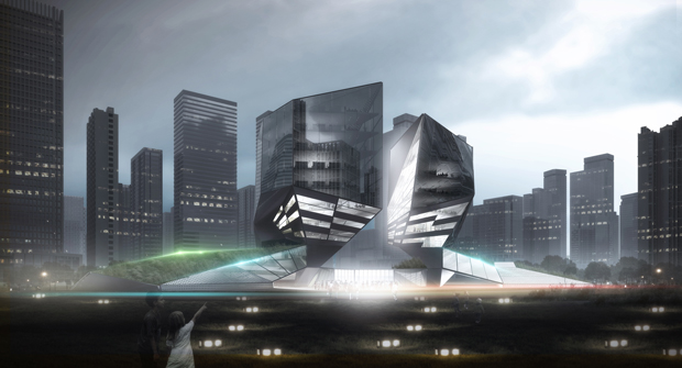 Towers that are fragmented yet connected through bridging and public commercial space is the interest in this conceptualization of the mid rise. By creating an office space to accommodate the design disciplines, it allows for a sharing of ideas in various studios and discourse, along with an exhibition showroom for the public to engage with. The study is placed in the setting of Shenzhen Bay, a developing community in the midst of a dense metropolis. With views facing the sea and city backdrop, it was important in the study to consider the scale and morphology of the design office center with these as focal points in the investigation. The torquing of the crystalline massing allows for multi-angled views and projection walls for digital installations. Cityscapes and natural formations have a dynamic relationship on the formation on cultural buildings and design practices within each site and project condition. By exploring the concept of office space and culture within these conditions, it becomes an actor in its manifestation. – from the architects