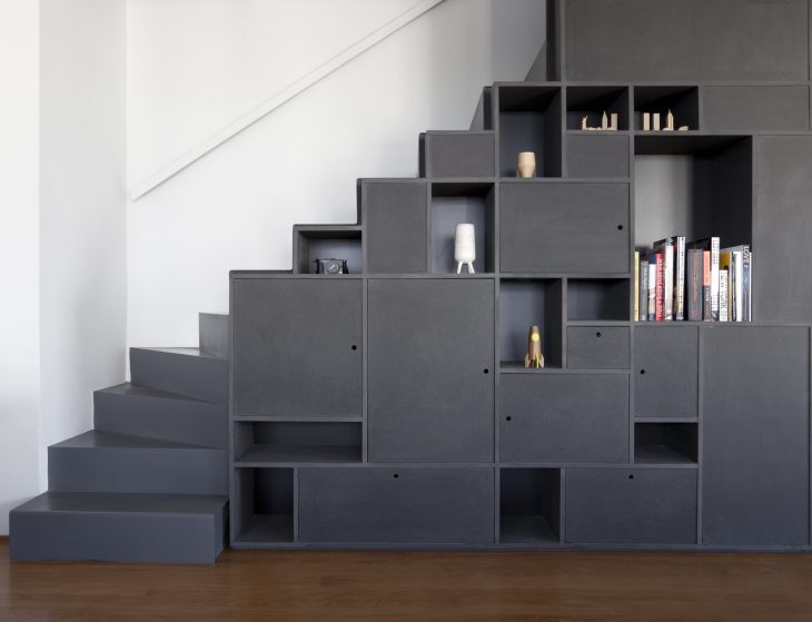 The project’s main element is the great sculptural void which connects the three floors of the apartment, allowing sunlight to invade into the space and creating different visuals. Drawing this void was the start to the whole project, with its form being strongly determined when the natural light, coming from the terrace, bathes the whole interior. There already was a central opening in the original apartment. Therefore, our proposal was to transform this void into a great lighting sculpture. Its irregular geometry answers to the pre existing structure as a way of rearranging the program – made of a living room, two suites, a lounge and a terrace – in three dimensions.