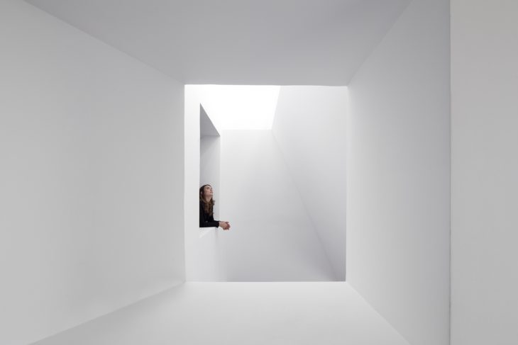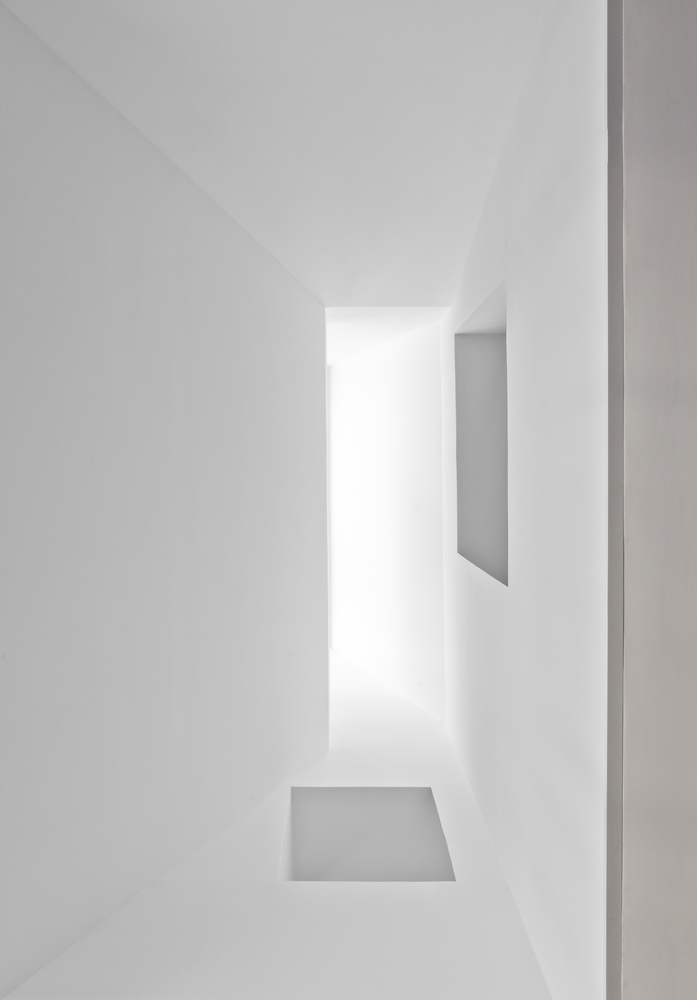 It proposes, on one hand, new views by different openings, and on the other hand subtle changes of light and shadow throughout the day and year. The angular walls create a rich game of dissolving whites in the central space, making the edges appear and disappear by each hour. The internal faces conform different rooms, giving them amplitude and different functions, as headboards or benches for example. It is the construction of this void that gives meaning to the entire space by which life unwinds.