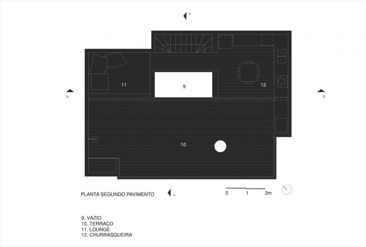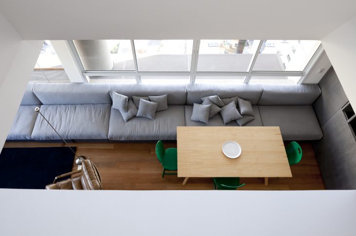 The project’s main element is the great sculptural void which connects the three floors of the apartment, allowing sunlight to invade into the space and creating different visuals. Drawing this void was the start to the whole project, with its form being strongly determined when the natural light, coming from the terrace, bathes the whole interior. There already was a central opening in the original apartment. Therefore, our proposal was to transform this void into a great lighting sculpture. Its irregular geometry answers to the pre existing structure as a way of rearranging the program – made of a living room, two suites, a lounge and a terrace – in three dimensions.