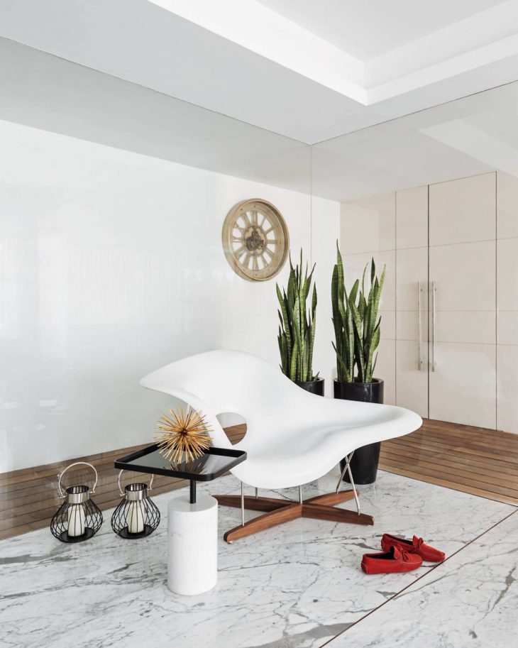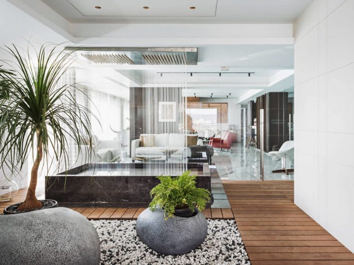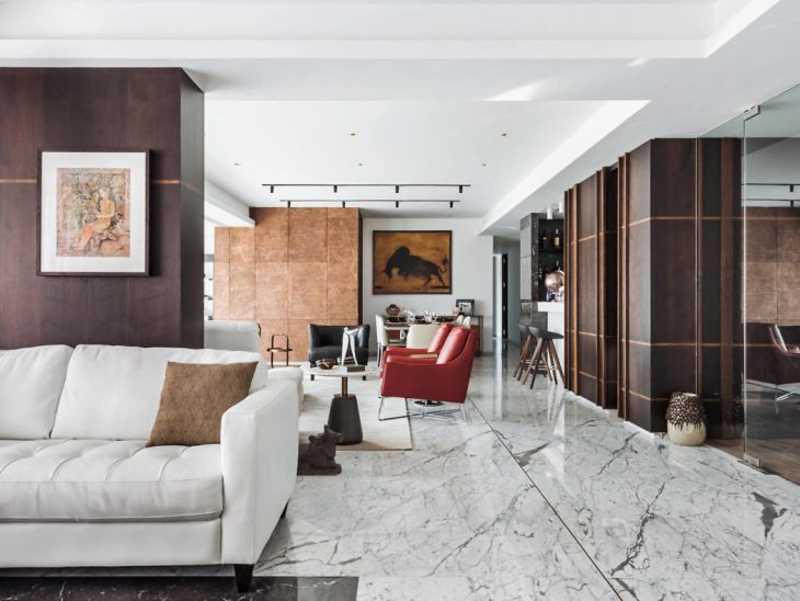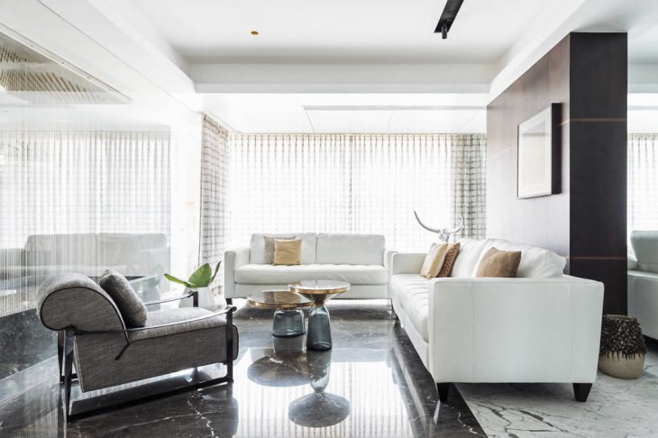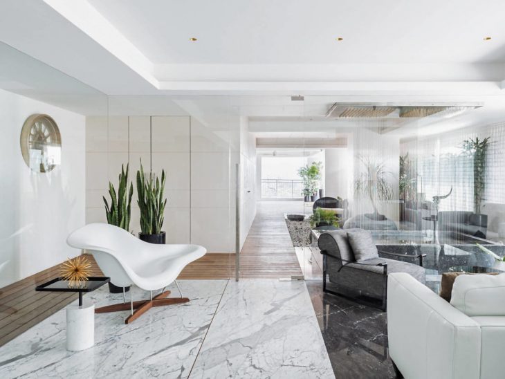 From the architects: The 5 bedroom home is a result of amalgamating two adjoining 4 bedroom apartments, where the living rooms shared a common wall. A reworking of the layout resulted in combining the bulk of the two living rooms into a large space and retaining the majority portion of one of the two apartments, as an extended balcony. To enhance the inside-outside connect between the primary living space and the ‘perceived outdoor’ of the balcony, the interface between the two spaces is of openable clear glass. Moreover, an area within the living room has its flooring highlighted which extended into the balcony, visually integrating the two spaces. The space within the balcony is differentiated into zones, changes in materials – marble, pebbles, wood and greens, which allude to different moods and functions.