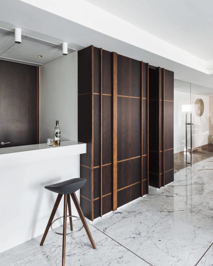The material palette within the home is fairly muted – Venatino and black Marquina, the two marbles, with a fumed oak as dominant veneer across the home; with each space being differentiated and characterized by the usage of a complimentary material.