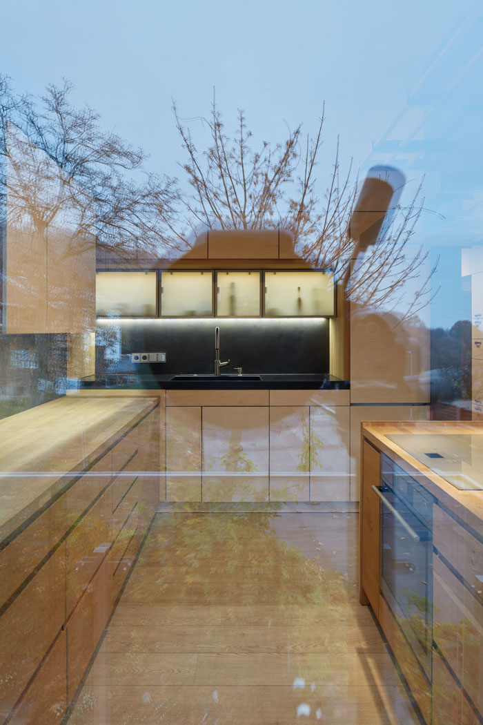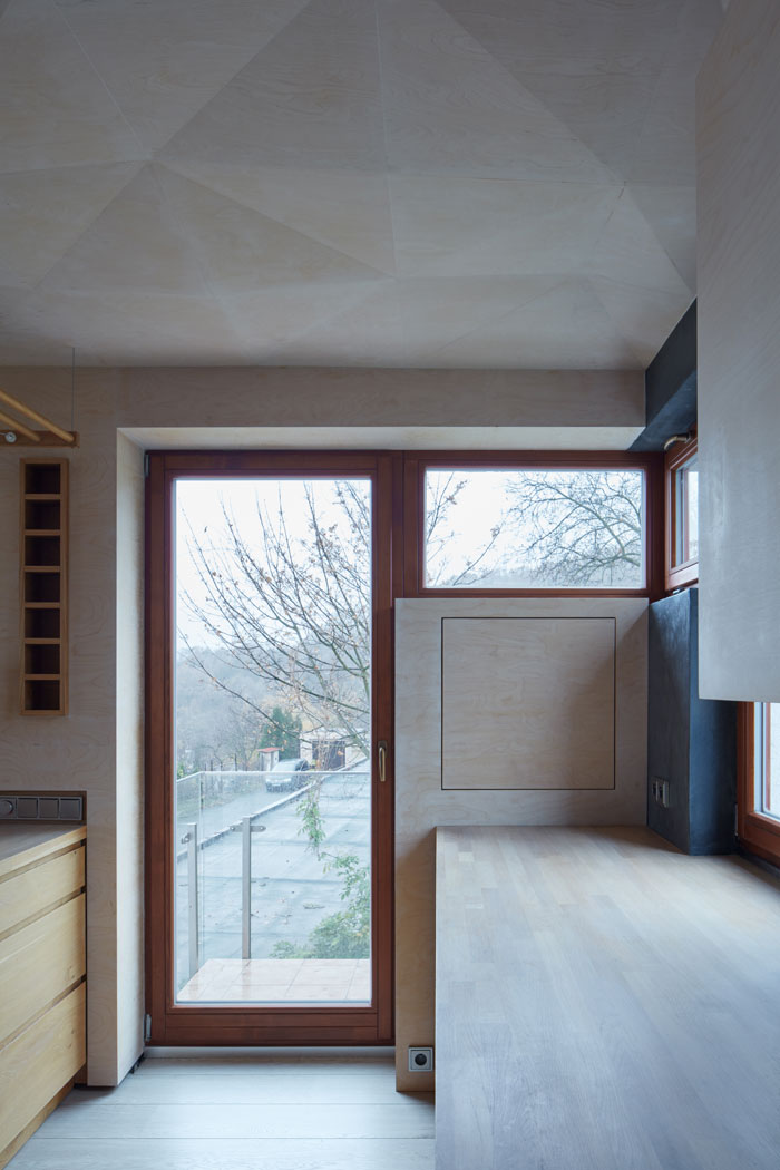 “The original unnecessarily large (however dark) entrance has been divided by a closet wall into a hallway and walk-in closet. The entrance hall is therefore much lighter. Furthermore, at the very moment of entrance, there is a much stronger visual connection with the window at the back, near the dining table. The closet room in the centre of the disposition works as a filter into the bedroom and recording studio. The kitchen takes form by the extrusion of large “drawers“ coming out of the walls. Similarly, the countertop by the sink is formed by pulling out a part of mass that it then placed on the other wall. The inserted countertop and sink are made of African granite with a structured surface. The wall with randomly placed shelves is also covered with plywood so it would be soft at touch and for leaning against and therefore becomes a living space. Also in this wall there is a small wine cabinet. The shelves wall with small drawers across the room is a space for books, sound system and other objects from the equipment of the musician.” from the a-sh Architects