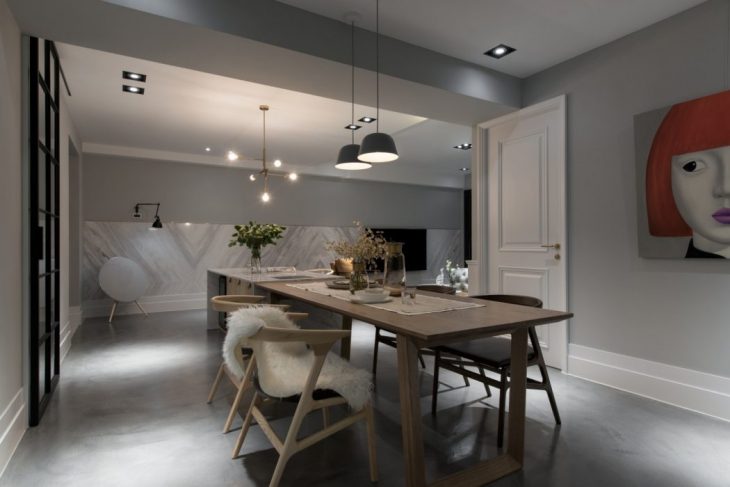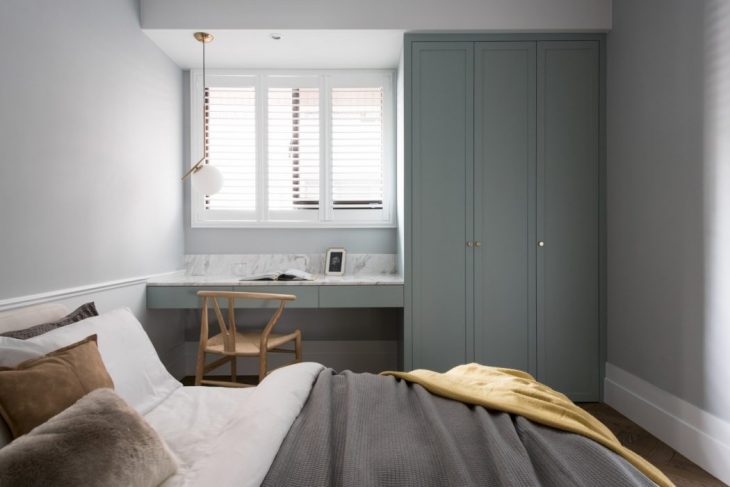 As the family has lived in America for a long time, they wanted to make sure when they were moving back to Taiwan, they did not lose that familiar home feeling they had grown used to in America. They decided, for their old apartment in Taichung City, to choose the style of the interior to be in an American style, but mixed with a modern look. To make it more simple and casual but still having that elegant feel and atmosphere. The space which the family cares for most was the dining room. They enjoy hosting and having friends over regularly to eat so an island and at least eight seats were added which gives plenty of space for hosting friends. The materials used in this apartment include steel pieces with titanium coating, light-colored wood veneer, white marble, wood herringbone parquet floor for the bedrooms and Pandomo for the public floor. The large use of white and gray paints, mixed with a main pastel green color and gold hardware accessories, add more unique personality and a warm feeling into this space. The whole space shows the co-operation and cohesion between different materials and chosen furniture.