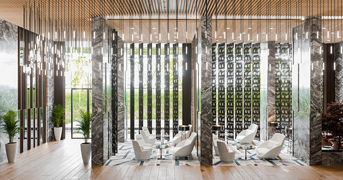 From the architects: The apartment interiors and the lobbies carry similar design aesthetics: bright hues are contrasted with darker tones. Light colored materials were given preference due to the modest sizes of the apartments, but darker shades of the natural marble textures of Onyx and Cala Catta accentuate and sharpen the spaces. The vertical wooden detailing and the see-through partitions are giving more depth to the interiors of these small apartments.