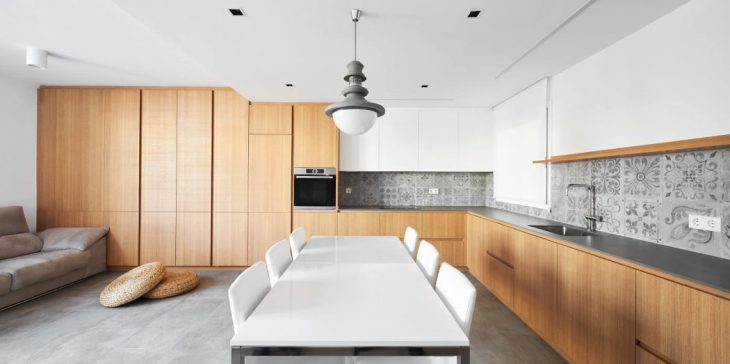 With regard to housing equipment, this is done by creating two furniture elements: one for the kitchen, living room and dining room and the other for the study, in an integrated way and promoting the spaces of those who are part of it.