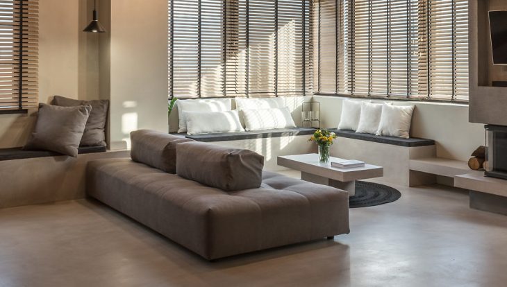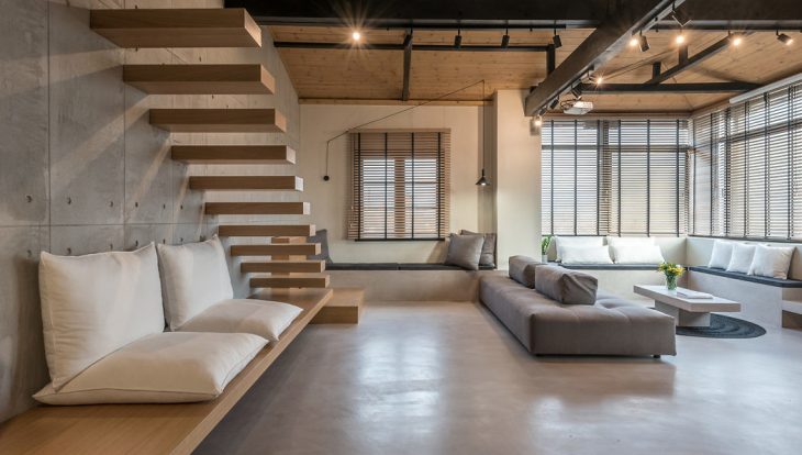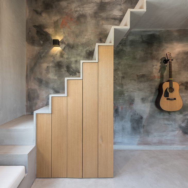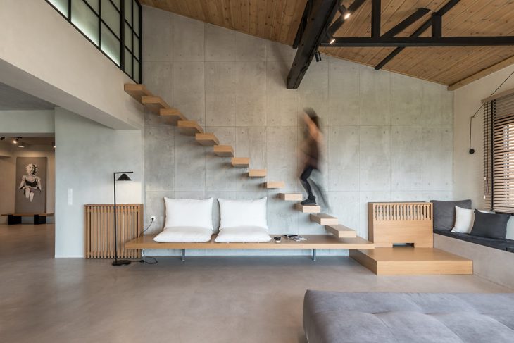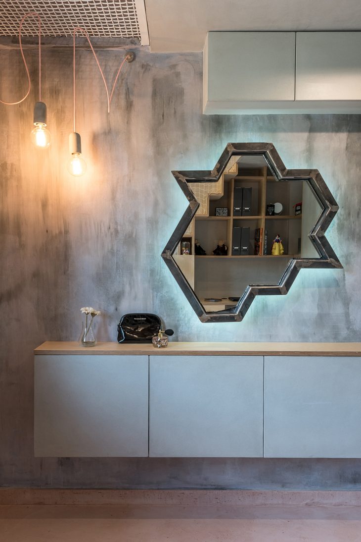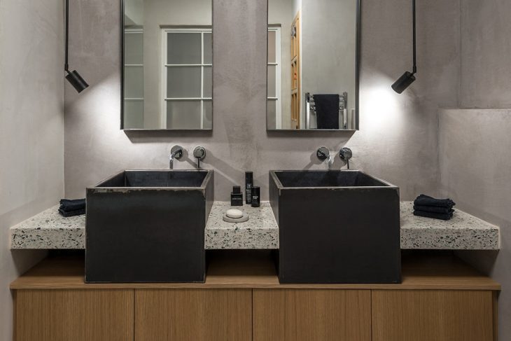 From the architects: The core idea behind the concept development for this project was the application of countryside house principles into an apartment space, for a family of six. Therefore, the design proposal includes multiple small and functional private spaces for each family member and focuses on elaborate and spacious living areas around the house that encourage common domestic activities. The house consists of an open entrance, dining and living room area, a kitchen, two bedrooms for the four children, an ensuite master bedroom, three bathrooms and an attic. The ample use of Kourasanit natural filler coating creates a prevailing sense of a monolithic housing structure while offering the flexibility of an almost sculptural treatment of the material in a variety of interior applications. The architects employed a muted colour palette to create a cozy environment, experimenting with different textures on the walls and ceiling. In between the living and dining room an enclosed space separated with metal framed glass doors, is used as a home office. The kitchen counter and cupboards were also coated with Kourasanit filler on a neutral grey palette allowing the black metal and wooden details to stand out. An elongated terrazzo table with extra storage space serves as an everyday dining area. A unified flooring texture spreading from the entrance hall all the way to the living room, results in a compositional continuity and cohesion, which is emphasised by the extrusion of the floor coating into built-in benches under the windows. A double sided sofa works as a divider for the two living room areas. Wooden floating steps that lead to the roof, hang from the wall while creating another sitting spot for the big family gatherings. The two bedrooms for the four girls of the family, have loft beds, allowing the maximisation of usable space, making most of the limited square meters. The space created under the staircase is used as extra storage. Varnished plywood and Kourasanit coating is again used in these rooms, in a more playful tone in terms of colours and textures. An almost white palette sets the background for the master bedroom, with only few brass and wooden details. Behind the bed, a metal frame window separates the room from its ensuite bathroom, where custom made metal washbasins sits on a terrazzo counter.