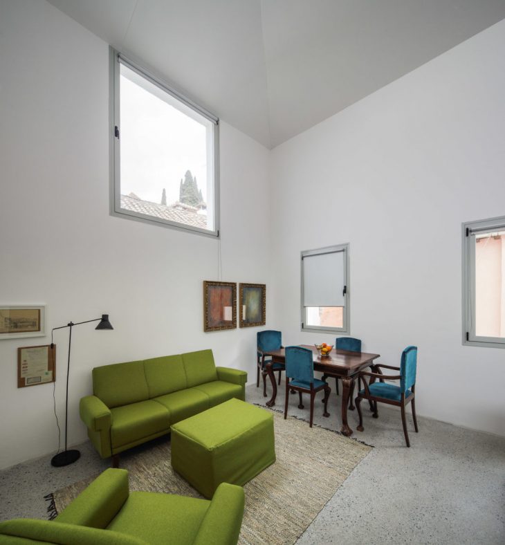 The exterior of the building conforms to the requirements and regulations of the historic center of Granada. It is manifested through a continuous white wall without other adornment than the windows, all the same, following the typology of the neighborhood, with no other pretension than to integrate in the place. Inside the garden on the south-east and south-west facades, the windows alternate with other larger glazed openings.