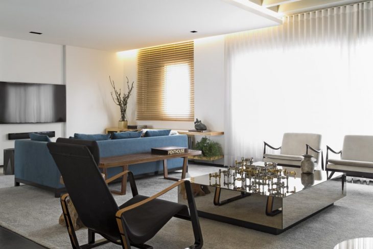 “When cleaning the apartment, we came across a well reinforced structure and soon we decided to use it to give personality to the project. In addition to the gain of indoor height that it has provided, the decorative effect of the structure of beams is one of the biggest attractions of the social area. ”
