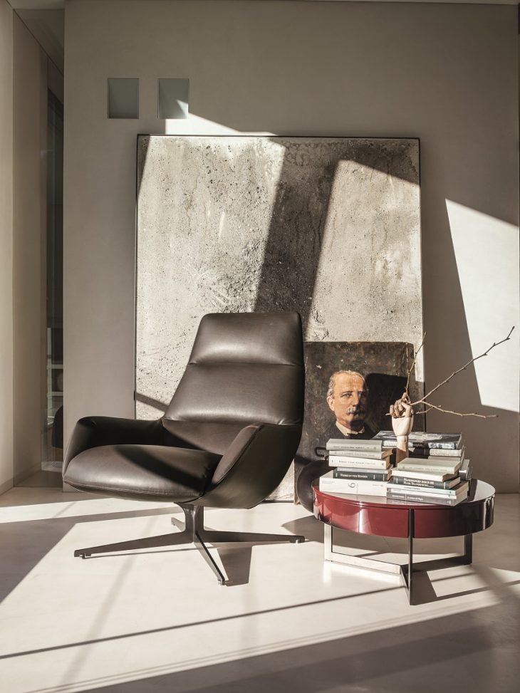 At the heart of exhibition space, the wide living space is furnished Neil sofa by Francesco Rota. Refined and original, Neil is a fresh new proposal with a strong appeal for those in search of more informal relaxation or the luxury of shared moments. This modular sofa is the perfect synthesis of made-to-measure comfort. It is distinguished by its low seat, its generous shape and squared back and arms which, slightly inclined outwards, enhance the feeling of comfort and well-being. The whole system rotates around a platform which can accommodate the sofa back and arms at two different heights. The chosen composition thereby determines the design and the function of the sofa: a low back and arms are suitable for a more relaxed position, while the version with the high back is more suitable for receiving guests. A combination of two modules with back and arms of different heights gives interesting movement to the sofa and makes it suitable for various uses. The finishing touches really distinguish this sofa: from the 50s-style feet reminiscent of those on the Moon lander that put Neil Armstrong on the moon, to the elegant stitching around the perimeter of the sofa to enhance the design.