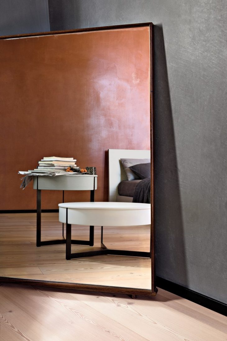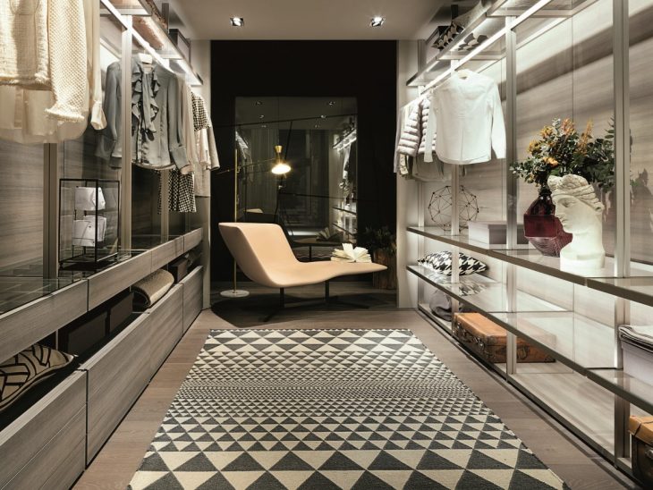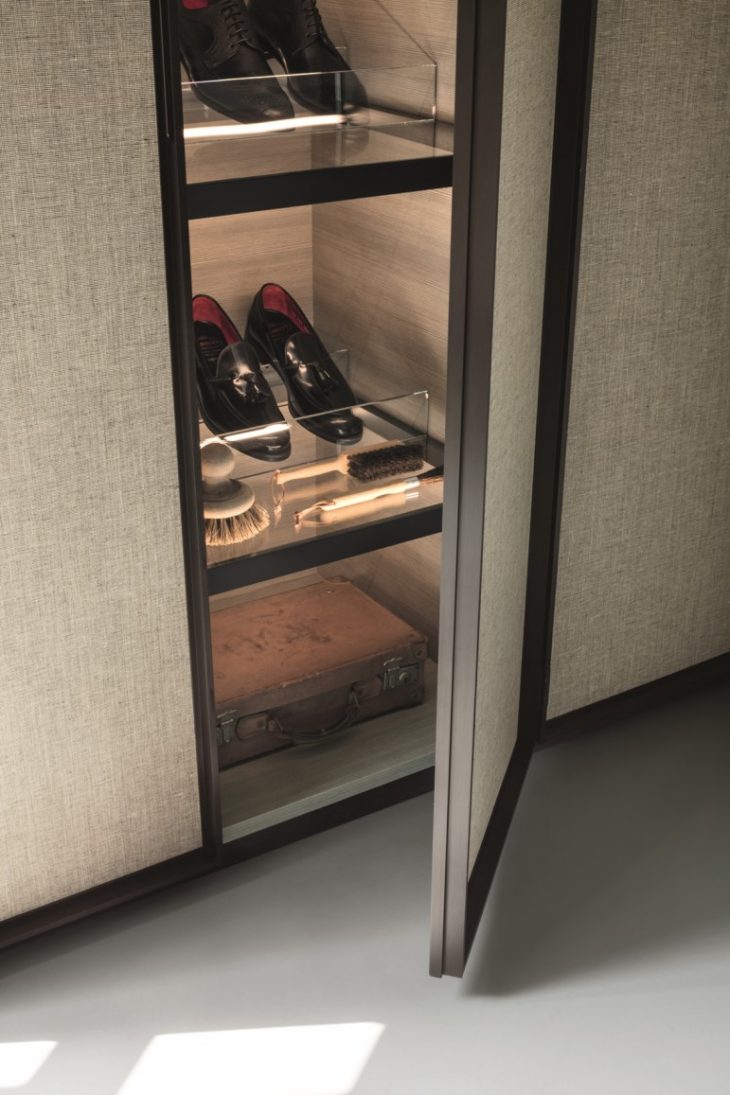 Behind the living, an area dedicated to night systems presents Hangar walk-in closets designed by Piero Lissoni – in grey larch finish – is designed to store everyday objects, rationalising the space but also implementing any planning idea. Every object is neat and free at the same time: an intelligent, functional system structured on the needs of who inhabits it. A charming product thanks to the warmth of the wood and lightness of the glass and its reflexes. A tailor-made solution, appealing for its endless design possibilities, where the various elements and accessories are fitted along elegant floor/ceiling metal uprights that concur in supporting the weight of the equipment, providing a precise style and quality detail.