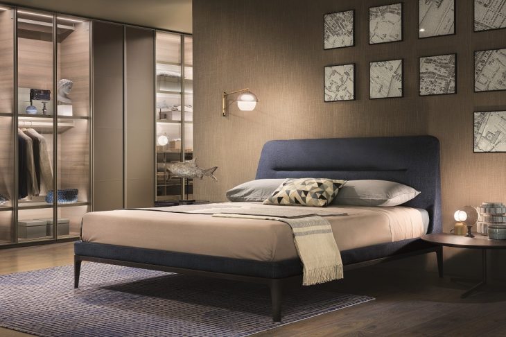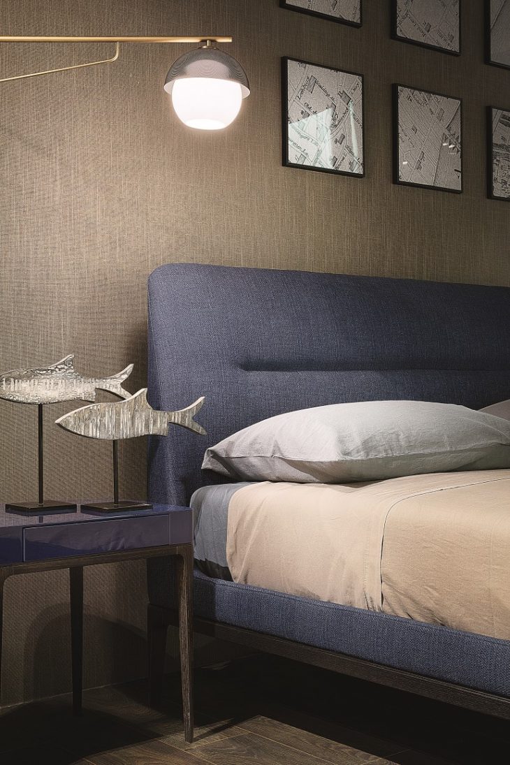 The exhibition continues at the upper floor where a refined bedroom is set with the textile bed Victoriano by Roberto Lazzeroni. With its regal air, the upholstered bed with solid wood structure, it is inspired by stylistic elements of the past brought up to date with a contemporary design. The design is distinguished by its high headboard, slightly curved at the sides to accommodate the mattress, and embellished by central topstitching. A continuous gentle line connects it to the bed frame, resulting in a design of great elegance suitable for every home. Although the bed has a classical design, it will grace any modern environment. The unmistakable hand of the designer gives life to Vic bedside table a product that recalls classical lines reinterpreted in a modern guise. With its agile solid wood structure, Vic is available both with drawer, finished with an elegant leather bottom, and without drawer. For both versions the top is available in glossy or matt lacquer and in a thin marble. The set is completed by Oydo coffee tables by Rota and by Lennox lounge chairs by Gordon Guillaumier.