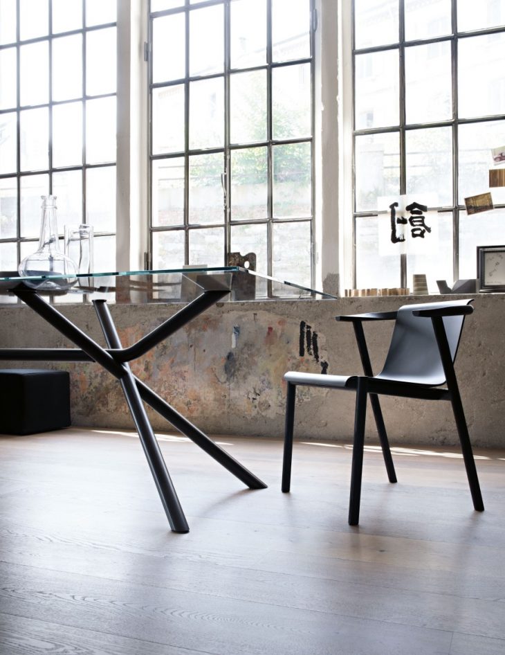 Selecta introduces to the left exhibition ambience where Graceland by Christophe Pillet are the protagonists matched with refined Bea dining chairs by Roberto Lazzeroni – and Cases containers by Francesco Rota. Various styles with vintage touches for Graceland round table that plays on neat and rational shapes that make it suitable for any kind of home but also for contract spaces. The metal structure of strong personality contrasts the lightness of the matt lacquered thin top or in the sophisticated Clay finish.