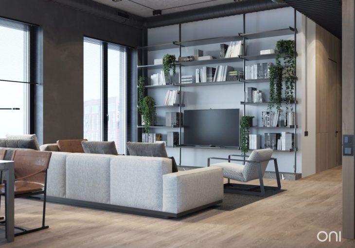 In this project we combined the character of an industrially developed city and the necessary amenities and coziness of living space. The use of simple contrast materials, open wiring and ventilation communications in conjunction with metal slats on the mirror base, reflect the combination of pragmatics of the industrial era and the romanticism of the metropolitan. All this comes alive and acquires warm colors because of the local integration of comfortable furniture, which is convenient for both passive and active recreation. Such a concept helped to reflect the reserved and strict temperament of the customer.
