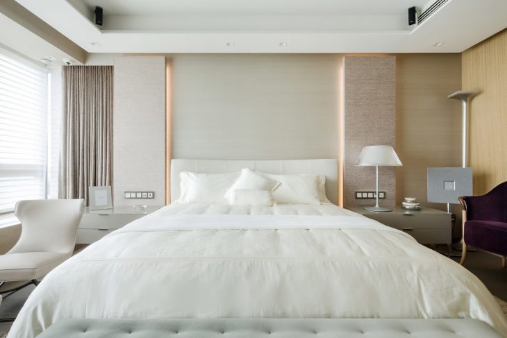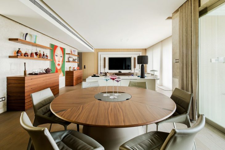 Hard and simple lines are used in the whole room to outline men’s boldness. Contrast between wood and stone texture highlights the beauty of solemn and quiet. Open layout shows a sense of magnificent by connecting all spaces while meeting functional requirements. Top-notch original furniture shows a perfect gentle texture; the curved sofa in the living room soften the hard straight lines and enable intimate interaction between host and his guests; art paintings hanging on the wall adds free and lively ambiance to this rational and silent space.