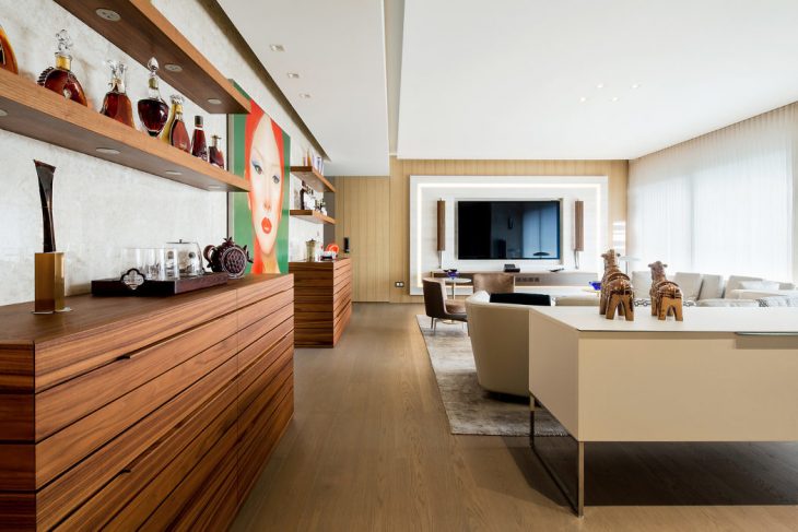 Besides the delicacy and exquisite external expression, the significant humanistic appeal and life precipitation of an old gentleman is the unduplicated charm of this space. In his youth, Mr. C worked as a bartender in the USA. He loves collecting wines, as well as Italian crystal and auction paintings. Super Normal’s careful consideration is fully reflected in the design of the study. It is not a traditional study but a red wine and cigar bar, where one can read books, watch movies, smoke cigar, and drink wine; it is as rich and varied as old wine, matching perfectly with the personality of the owner.