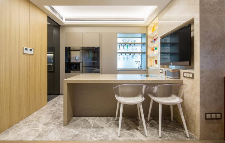 The western-style kitchen is the most frequently used space for the owner. So the selection of materials of the whole house starts from a low saturation champagne baking vanish board of Armani/Dada in the western-style kitchen, then extends to the wood floor, wood finish and the type selection of other texture. Grey champagne is taken as the main tone, and dark and light colors are used to distinguish public and private spaces, to create an emotional experience of having boundaries while having no boundaries.