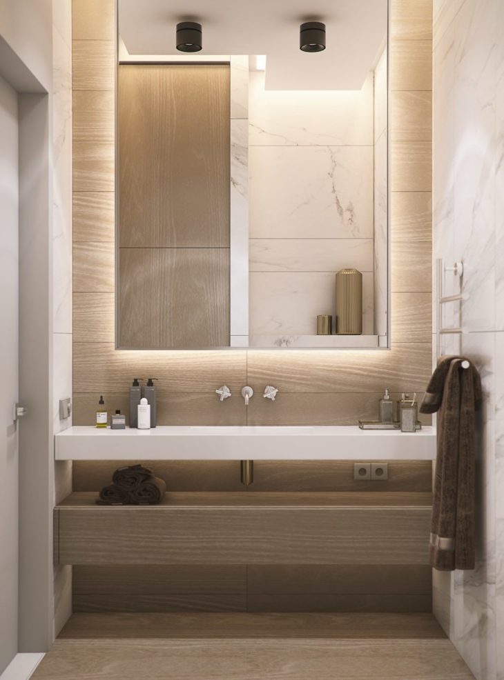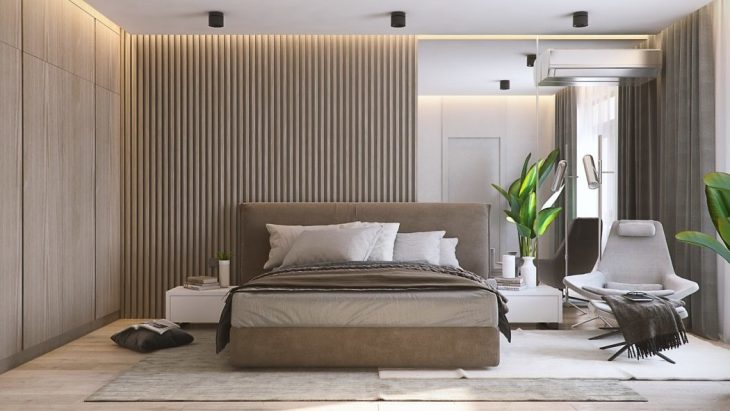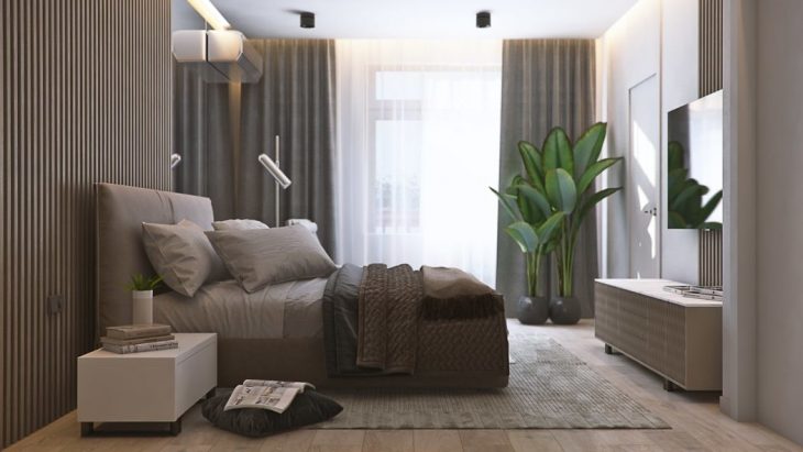 The master bedroom provides enough space to fit a large bed, a capacious wardrobe and a cozy zone with a comfortable armchair. The bedroom is linked to the master bathroom, which is equipped with a large shower cabin. So, all the interior zones and elements are arranged in a way that would facilitate all the processes and the scenarios that are going to happen in this apartment.