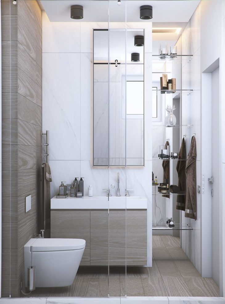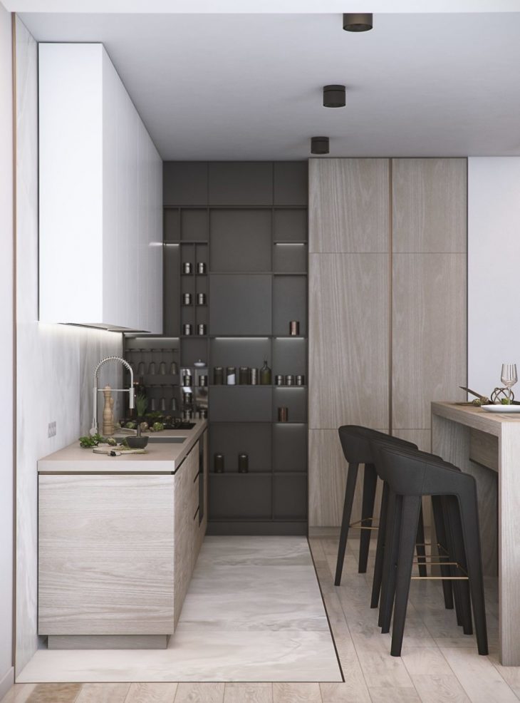 From the architects: The initial layout led to the logical partition of this apartment. So, there is a day zone on the left hand from the entrance, and the private zone on the right hand. The entrance is isolated by sliding glass door. The open-space formula for the day zone is the best one to fit the client’s requirements of a functional and laconic space, where there are no useless elements. It consists of three zones – the living room with TV area, the kitchen with a TV-oriented bar, and the dining zone.