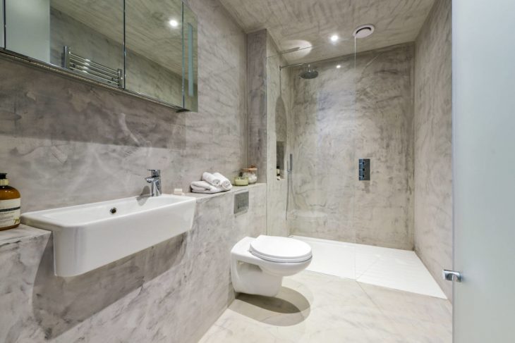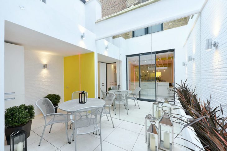 The lower floor has been arranged impeccably to provide the most incredible space for both dining and entertaining, there can’t be many better. Light pours in the front via the breathtaking light well and into the rear via the wide, triple bi-fold doors and full height structural glazed window beside it. A poured resin floor and exposed beams add to the feeling of modern industrial; so does the eco-alcohol fuel fire built into the sleek, west-wall, low-level storage with its slate surface.