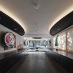 The architects created a circular rug with strong visual impact that was produced in Pakistan and unites the numerous colors on exhibit, from the various hues of blue to orange and light beiges, to provide a sense of warmth and “embrace” the various pieces present.