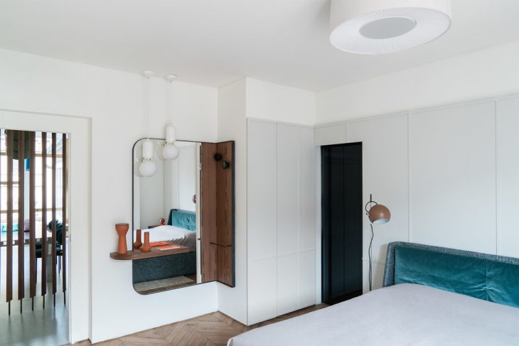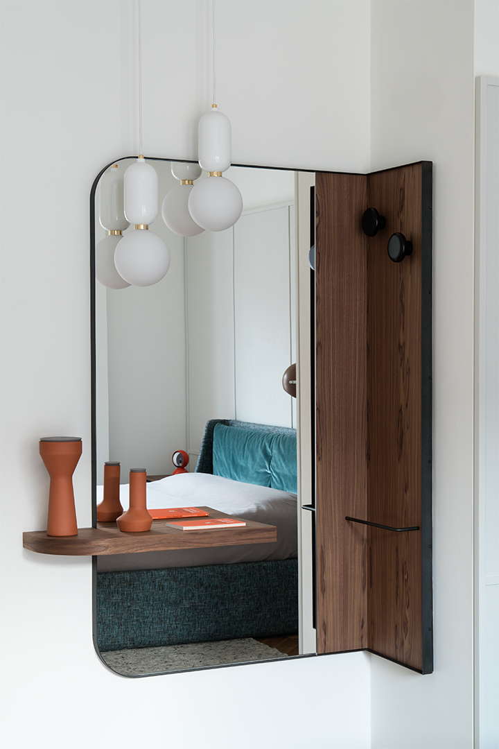 The master suite continues the chromatic and simple lines of the living area: in the bedroom a blue velvet bed and light grey wood panelling embraces the corner featuring a mirror and valetstand illuminated by Parachilna Aballs T hanging lamps.