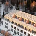 The building is conceived as a series of interlocked “towers,” rotated and bundled to direct views away from neighboring buildings and toward open water on both sides of the site. This compositional strategy produces a singular sculptural volume while maintaining legibility of its constituent parts. A subtle contrast between organic and orthogonal geometries runs through the project, reinforcing the idea of multiple forms working together rather than a monolithic slab. The entire structure is lifted 45 feet above the flood line, a decisive move that responds to climate realities while freeing the ground plane below.