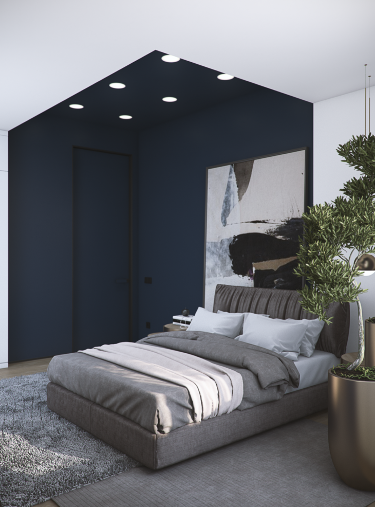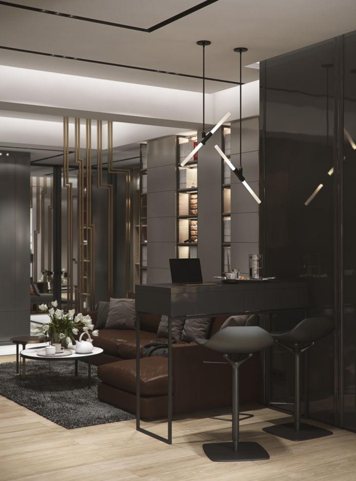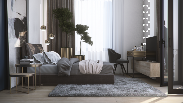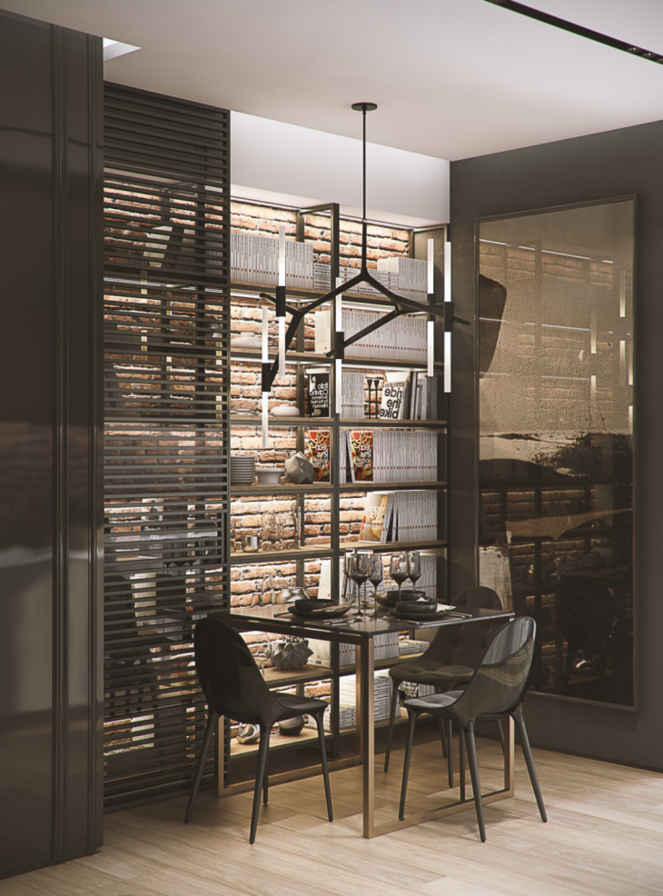 This space is a sophisticated and elegant residence for a family with a well defined sense of beauty. The dark shades give intimacy and coziness to the space, while the metallic accents embellish it with some glam reflections. The light in this interior has a huge decorative role, being softly reflected by the glossy surfaces of the walls and furniture. The brick wall is also lightened by the warm light, so that it looks textured and contrasting to the rest of the interior. The bedroom is about contrast of colors, shapes and materials: while the walls are plain painted, the furniture, the lighting and decorations are elegant and artistic.