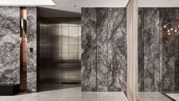 The abode is an eclectic extravaganza of natural marble paneling. Without too sumptuous measures, the space accentuates the innate elegance of rock veins comparing to metallic modernity. Grigio carnico is gracefully arranged in linear paneling forms, and white Cherokee marble transforms its vein irregularity into chevron pattern, pure yet lively. Titanium color-gilded metal trims delineate lavish modernity along the way. While sunlight shines through the curtain sheer, the space generates glamorous shimmers, culminating with luxury yet serene vibes for residence.