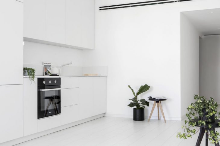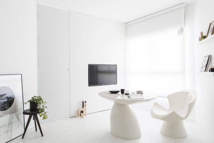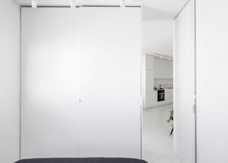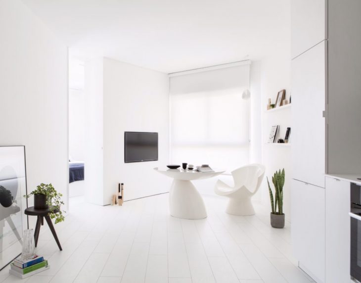 The apartment’s floor was covered with a minimalistic white parquet, the walls were painted in white color and all carpentry & furniture items were designed in white as well.