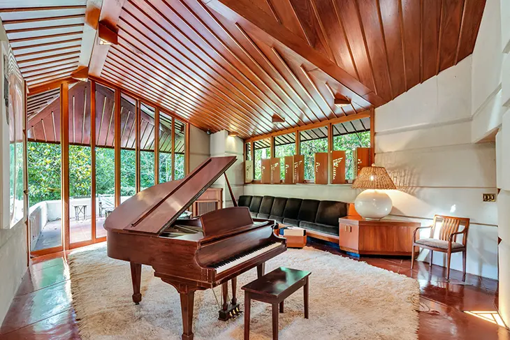 The design unfolds along a steep hillside, which determines both plan and section. Wright employed a parallelogram-based module that follows the contours of the land, embedding the house into the slope rather than flattening it. This geometry governs the placement of walls, ceilings, and circulation paths, producing interiors that expand and compress in measured sequence. Movement through the house follows diagonal lines, creating spatial shifts that feel calibrated and intentional rather than dramatic.
