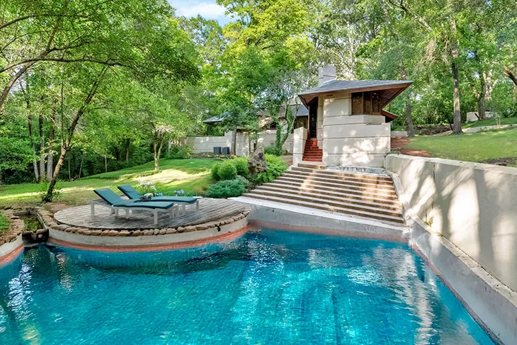One of Fountainhead’s most distinctive features emerges where architecture meets landscape. Wright extended the bedroom wing into the hillside, terminating it with a fountain that feeds into a swimming pool and then into a natural stream below. This sequence establishes water as a spatial and environmental element, reinforcing the house’s relationship to gravity, topography, and movement. The feature also contributed to the house’s alternate name, though its architectural clarity stands independently of literary associations.