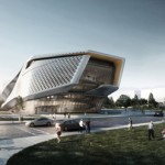 This architecture has an abstract form with random crossing curves on a rectangular body.