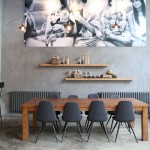 A staircase ascends up through the middle of all three, so all spaces had to be organised around it. It was built from grey powder-coated steel and features wooden treads with open risers.