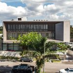 The wood cladded wall draws the viewers’ attention upwards, where the light influx from the second floor creates a play of light and shadows on the semi-cylindrical wood cladding, offering warmth and texture that contrasts the raw concrete flooring.