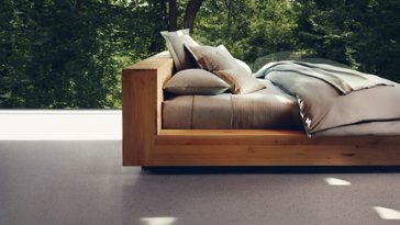 The dining room is floored in the same pale timber as the door frame, and has a single white column positioned in the corner to support the floor of the bedroom above.