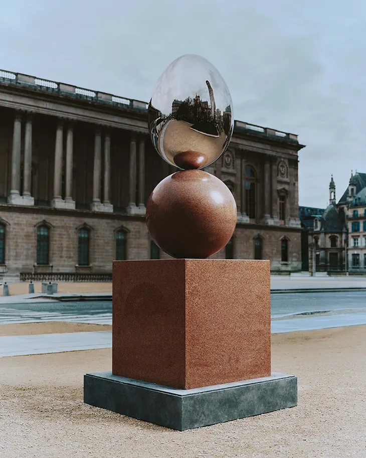 Before arriving in Paris, “Mirror Gate II” appeared in a markedly different context. The work was originally presented facing the Pyramids of Giza, where its form engaged directly with one of the most charged archaeological sites in the world. For its Paris installation, the sculpture returns altered by context, carrying traces of its initial setting while responding to the urban environment and institutional surroundings of the French capital.