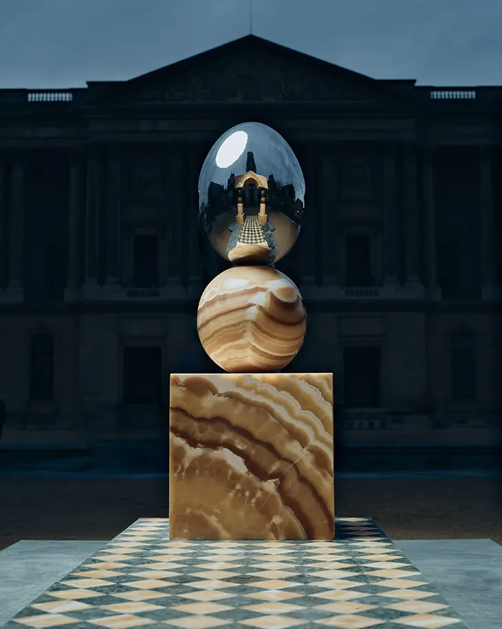 The collaboration between Pilar Zeta and Marmonil began with a chance encounter in Mexico City in 2024, rooted in a shared approach to stone and symbolic form. That meeting led to the realization of “Mirror Gate” at the Pyramids of Giza and continues with “Mirror Gate II,” presented in Paris from January 16 to February 15, 2026.