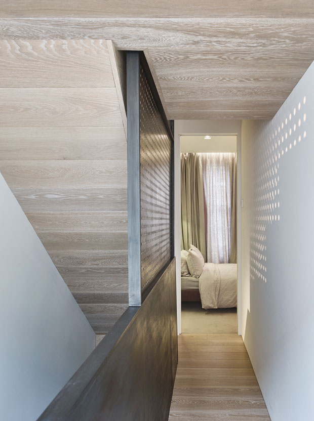 A restrained palette of industrial materials – raw concrete and raw steel, combine with refined glass, timber and carefully detailed plasterwork to create a relaxed but crisp interior. To solve the issue of a dark and unwelcoming basement level so common in this building type, we introduced a ground floor made up entirely of pavements lights, common but unappreciated on every London commercial street – repurposed here to allow natural light and activity to connect the first two levels of the building. From the basement level a handmade steel staircase connects to the ground floor and then works its way up to the first floor, at which point the solid steel plates transform into a perforated metal spine which cuts right through the building to the top floor. This use of the perforations throughout the house help to intensify the light through various aperture dimensions. – from Andy Martin Architecture