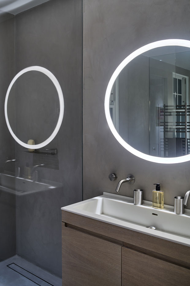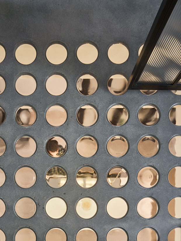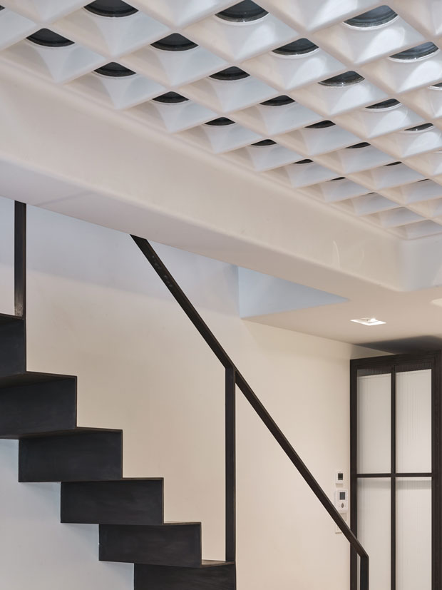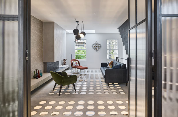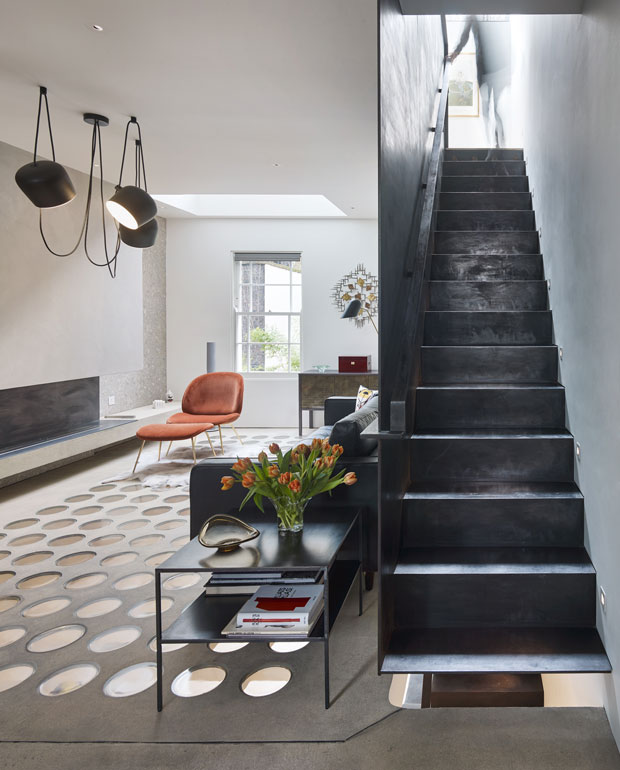 A restrained palette of industrial materials – raw concrete and raw steel, combine with refined glass, timber and carefully detailed plasterwork to create a relaxed but crisp interior. To solve the issue of a dark and unwelcoming basement level so common in this building type, we introduced a ground floor made up entirely of pavements lights, common but unappreciated on every London commercial street – repurposed here to allow natural light and activity to connect the first two levels of the building. From the basement level a handmade steel staircase connects to the ground floor and then works its way up to the first floor, at which point the solid steel plates transform into a perforated metal spine which cuts right through the building to the top floor. This use of the perforations throughout the house help to intensify the light through various aperture dimensions. – from Andy Martin Architecture