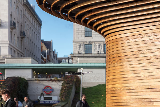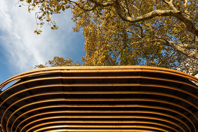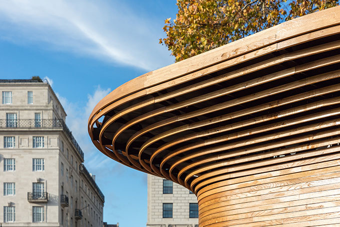 The flagship Horse Shoe Bend kiosk in St James’s Park, in view of Buckingham Palace, will be clad in tubular brass and mirror the ornate precious metals that adorn Sir Thomas Brock’s Queen Victoria Memorial, while the choice of timber cladding for the rest of the kiosks rests on the relationship with thepark environment. Entrusted with bringing Mizzi Studio’s curvaceous design to life, Tom Raffield is steam-bending the oak cladding. Mizzi Studio has used high quality materials throughout the design, from sustainable oak to oxidised copper, new copper, stainless steel and brass.