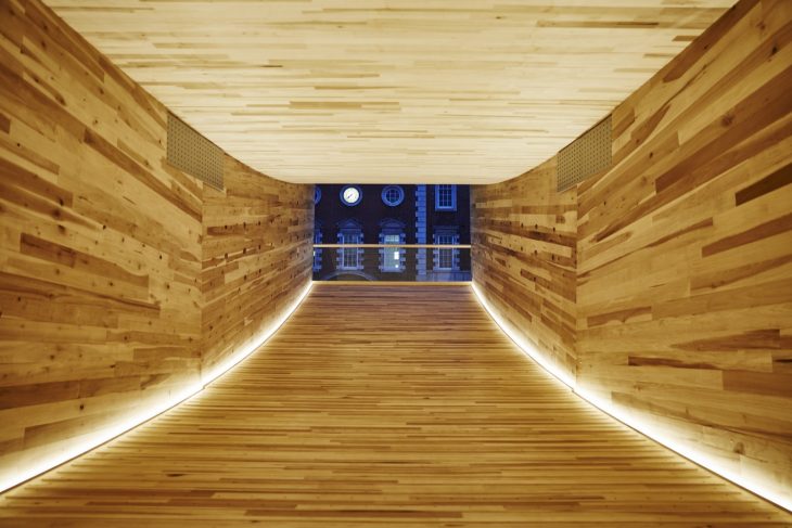 Alison Brooks Architects has collaborated with The American Hardwood Export Council (AHEC), Arup and the London Design Festival to present a cross-laminated tulipwood structure, ‘The Smile’ at the Chelsea College of Art Rootstein Hopkins Parade Ground from 17 September until 12 October. The Smile is one of the Festival’s Landmark Projects, which can be inhabited and explored by the public. The spectacular, curved, tubular timber structure measures 3.5m high, 4.5m wide and 34m long and is effectively a beam curving up at both ends. Showcasing the structural and spatial potential of cross-laminated American tulipwood, Alison Brooks’ concept is the first ever ‘mega-tube’ made with construction-sized panels of hardwood CLT.