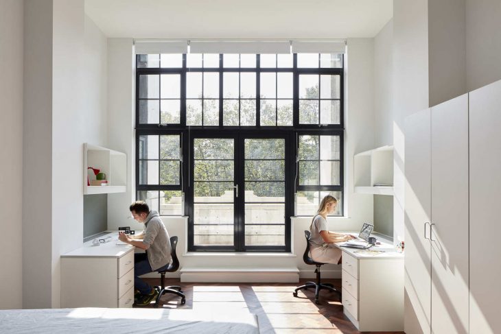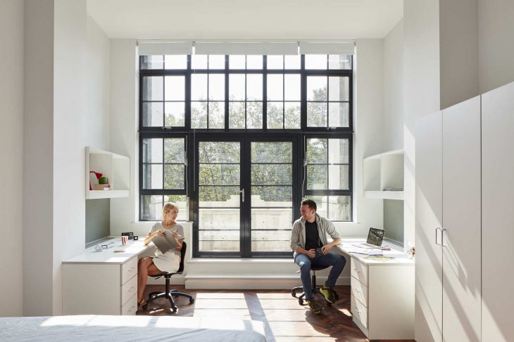 The student accommodation has 166 rooms, private student gardens and generous common spaces and lounges. It has been designed to support a high level of community usage – including twelve self-contained artists’ studios, an independently managed gallery space and a café, as well as a contemporary sky lounge which provides social space for students and gallery space for artist exhibitions.