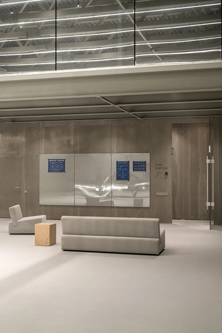 Interior and concept development was led by Dan Vakhrameyev, whose approach centers on restraint and material discipline. As Vakhrameyev notes, the design language relies on exposed surfaces, honest materials, and precise detailing to support the rhythms of pre- and post-flight routines. This attitude governs the entire project, from façade to furnishings.